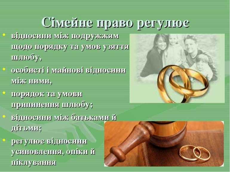Сімейний кодекс України регулює шлюб, права дітей, обов’язки батьків, аліменти, усиновлення та інші сімейні відносини.